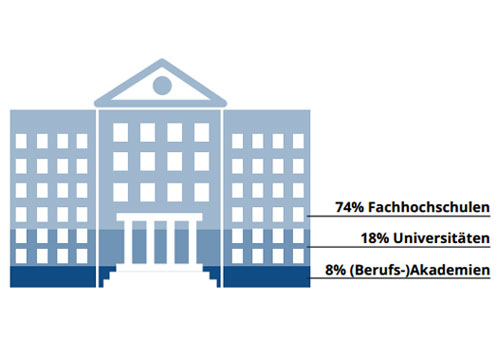 Studiert wird traditionell überwiegend an Fachhochschulen. Mit 58 Einrichtungen stellen sie die häufigste Hochschulart für ein Pflegestudium dar. Darüber hinaus haben 14 Universitäten und sechs (Berufs-)Akademien und anderweitige Institute ein Pflegestudium im Programm. Von den 78 Einrichtungen befinden sich 43 in staatlicher Trägerschaft, 15 werden kirchlich und 20 privatwirtschaftlich getragen.